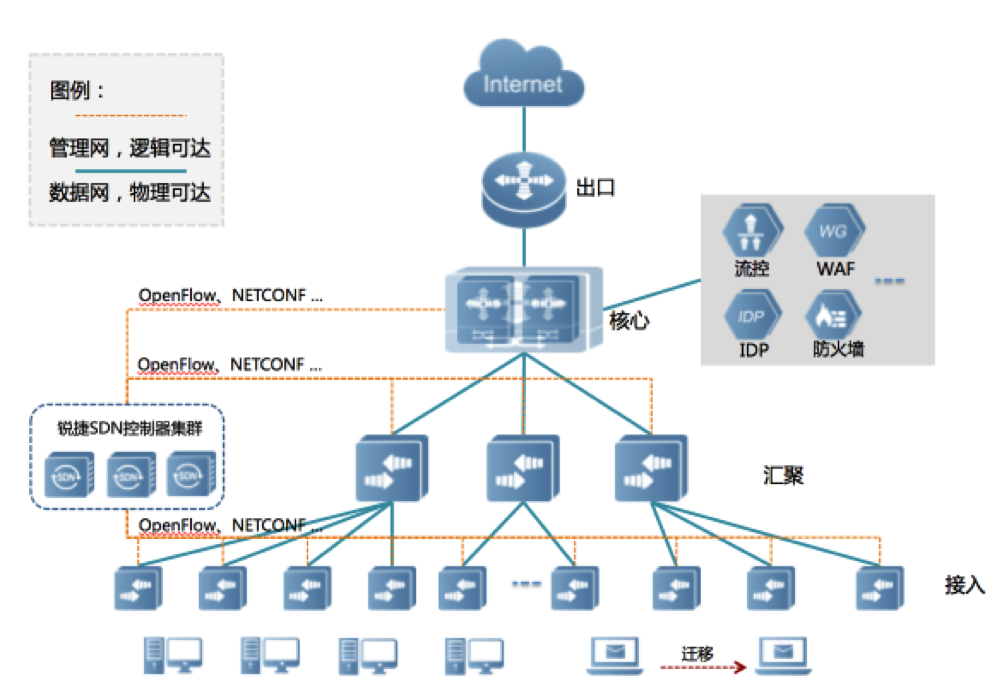 基于尊龙时凯网络RG-ONP平台构建的园区SDN网络,可以从接入终端管理、运维、出口资源管理、业务网络规划等方方面面展开。完全替代传统园区网络的部署模型。RG-ONC开放网络控制器通过OpenFlow、NETCONF等南向接口协议实现对所有网络设备的统一管理,从而实现快速部署、资源整合、统一规划、按需调用。
