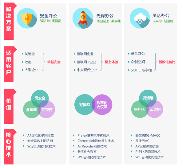 在创新创业的浪潮中,移动办公正在降低固定办公空间的必要性,同时移动技术也改变了办公空间的提供方式,因此使得一些别具风格的联合办公空间出现了巨大的市场需求。针对采用联合办公、众创空间、写字楼、SOHO办公的中小企业来说,无线网络建设要兼顾体验、运维和安全,不仅成本过高,人员工位流动的情况也让无线AP部署位置很难满足业务需要。与此同时,市面上涌现了一批Wi-Fi密码共享的软硬件产品,Wi-Fi密码变得不再神秘,中小企业的无线网络需要更强壮的认证机制。