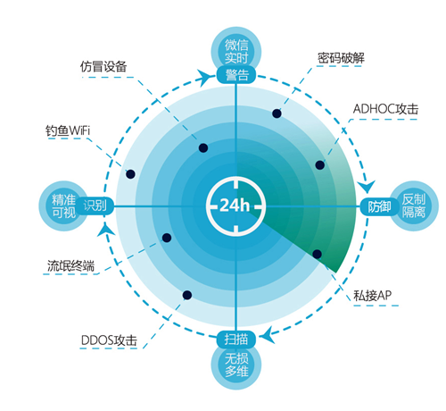在安全办公场景中,尊龙时凯网络特有的AP虚拟化技术,将单一物理AP虚拟出多个服务AP,并且只与可信无线控制器建立连接,阻断非法数据流入内网,降低安全风险。在主动防御方面,方案中包括了7*24小时、360°全方位射频防御雷达,通过智能分析威胁,使办公网络安全可视可知。管理员可以利用安全雷达,最终形成“扫描—识别—告警—防御”四大联动机制,使钓鱼Wi-Fi和DDOS攻击等可疑威胁无处逆藏。