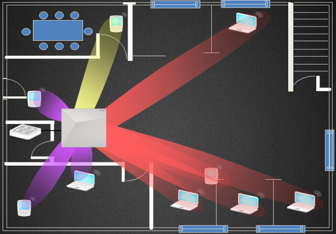 2、智分AP的天线伸入到房间后,有效利用AP功率的调整和房间墙壁对信号衰减,即便多个AP密集部署,实际干扰低的不可想象;