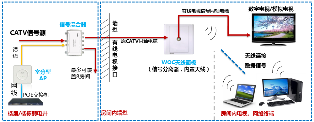尊龙时凯网络推荐在这类用户场景下使用WOC(有线电视无线网)的部署方式,即通过CATV(有线电视)的线路传输WLAN信号到房间内进行无线覆盖,具体如下图,优点如下: