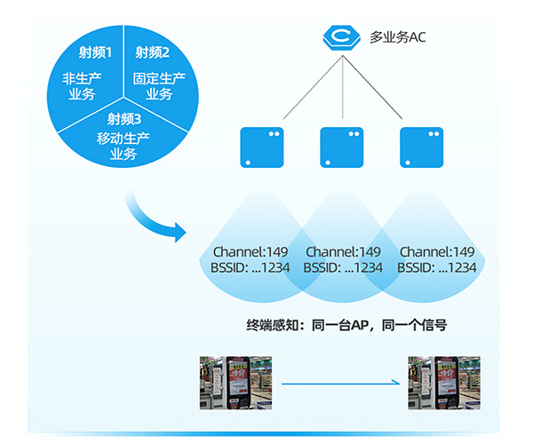 网络侧依靠多业务AC来调度多台AP,实现数据的地址去重、接入引导、数据转发,在终端移动过程中,做到漫游无感知,数据零丢包