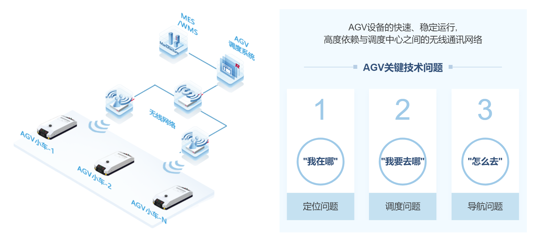 在工业制造领域,AGV移动机器人在作业过程中,为了解决自己 “我在哪”“我要去哪”“怎么去” 等几个关键技术问题,高度依赖自身与调度系统之间的无线网络通讯。