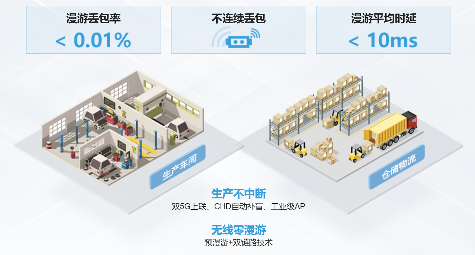 大型车间,穿梭车、搬运机器人快速在车间、厂区中移动,在多个无线基站之间来回切换,切换过程需高速漫游切换,满足丢包率≤0.1%且不连续丢包的网络需求。