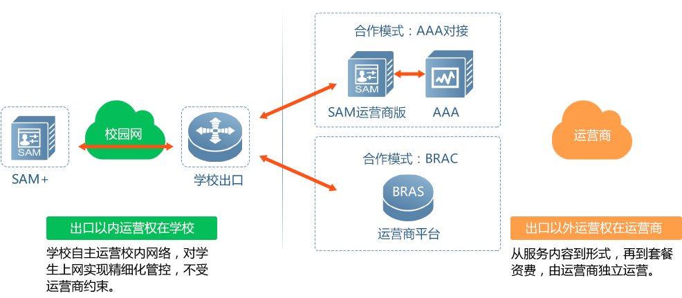学校与运营商边界隔离,运营商自主定制套餐提高放号量,对学生的管控完全由学校控制。 权责明确,互惠互利,巩固长期合作关系。