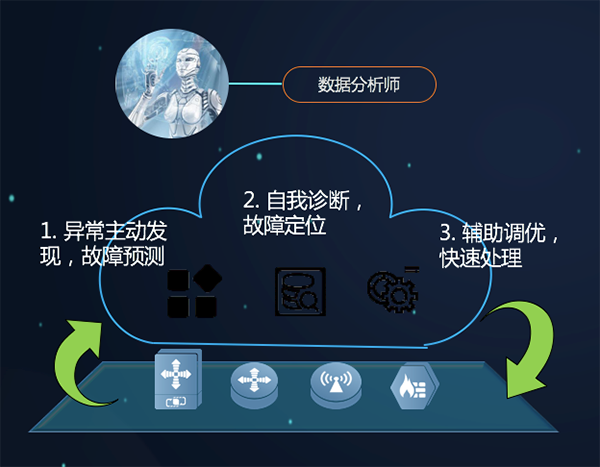 集成了SDN意图自动化网络+(网络专家/机器学习AI)分析系统+(可编程遥测)设备,运用数学形式化验证、网络遥测技术及AI算法、光模块异常发现和故障预测算法等关键技术,极简智能网络协助打造用户指挥中心、完善业务体验、大数据分析、主动运维、构筑安全立体防护。