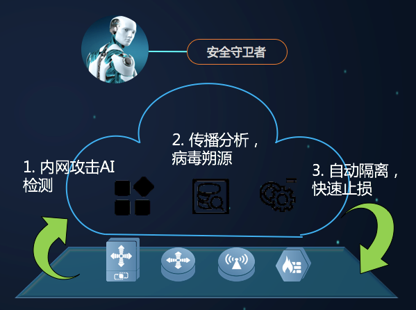 利用AI算法检测加密恶意流,基于行为分析发现内网攻击及其传播行为,并支持溯源;利用整网设备的ACL资源,结合持续安全风险评估和受限资源动态优化算法,构建持续的内网主动防御体系。
