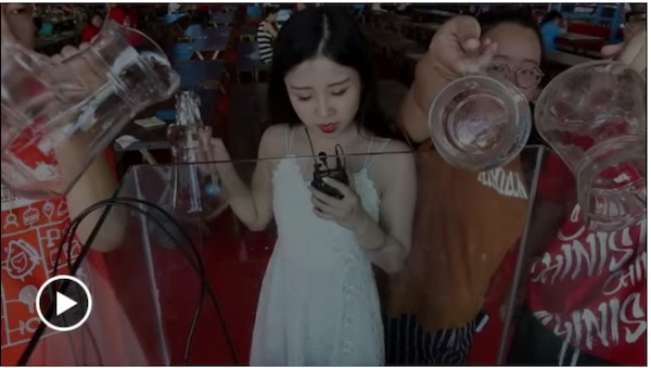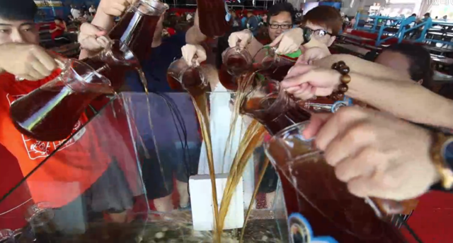 小姐姐带着几位吃瓜群众一起往缸里倒起啤酒: