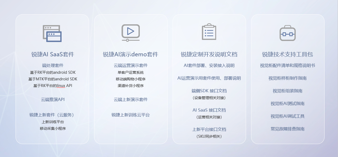 •第四,超低准入门槛:将智能化硬件组件的性能要求降低到,仅需可同时采集2路标清视频即可,硬件成本大大降低。而且云平台提供边端多平台SDK、购物小程序、运营DEMO套件以及开发说明文档等,整体运营体验平台向客户开放,可以随时无门槛体验。