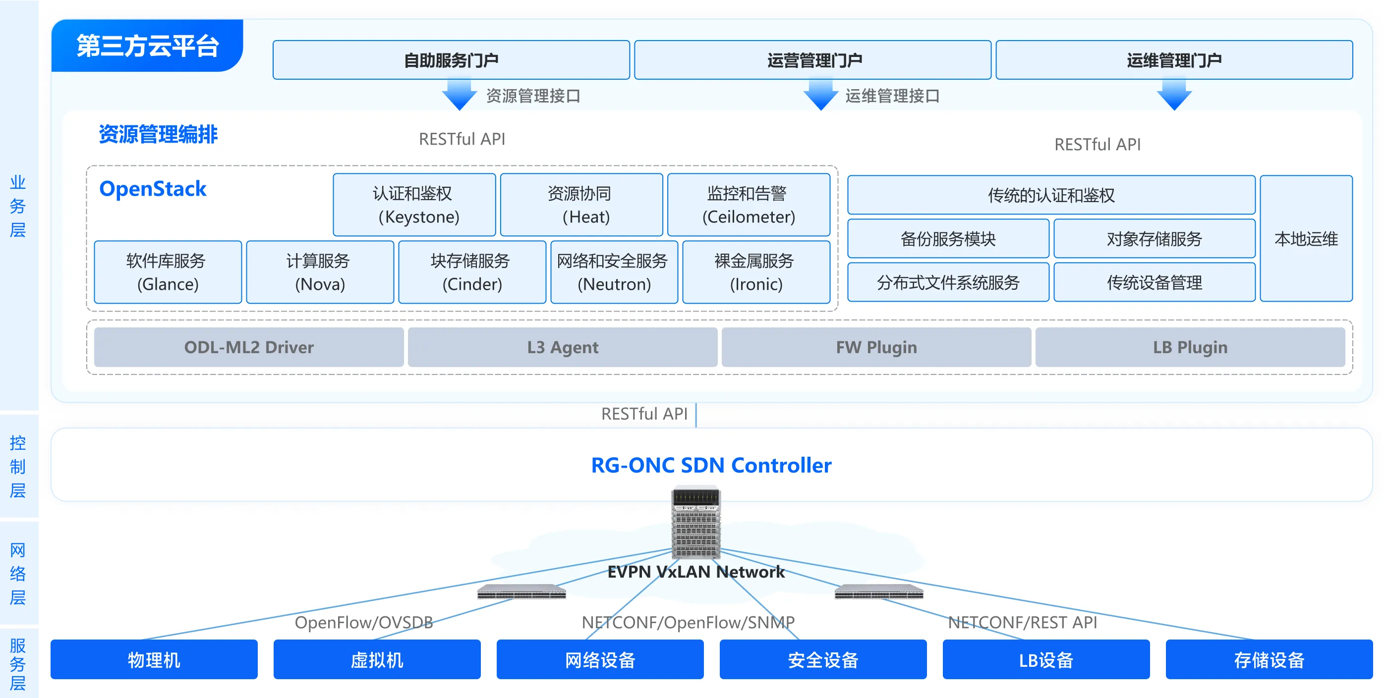 中国移动IT公司牵头建设某两个城市私有云资源池项目,尊龙时凯参与整体方案设计与集成,提供产品覆盖数据中心交换机、安全防火墙、负载均衡和SDN控制器,交付8个POD,包含RG-N18018-X核心交换机、TOR交换机、SDN集群、管理交换机等;实现大规模设备应用,高效交付,保障业务顺利开展。
