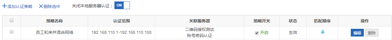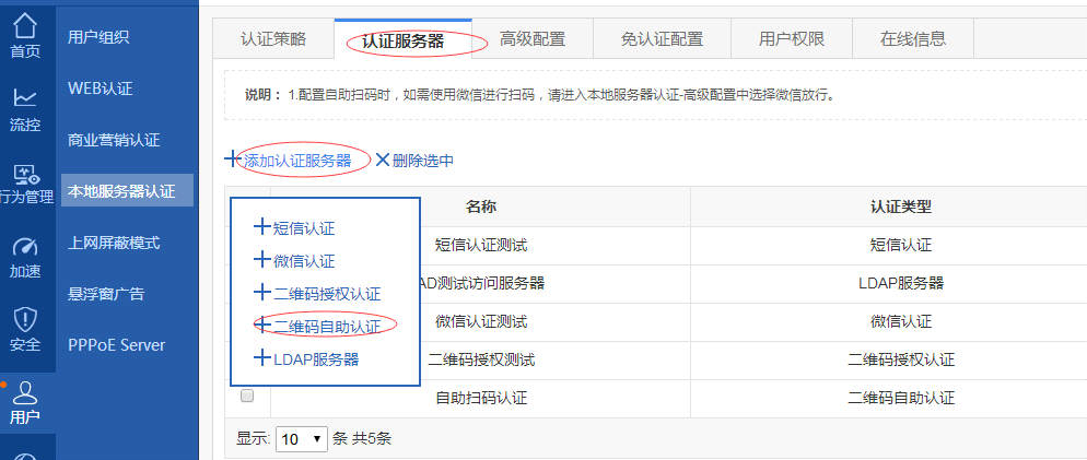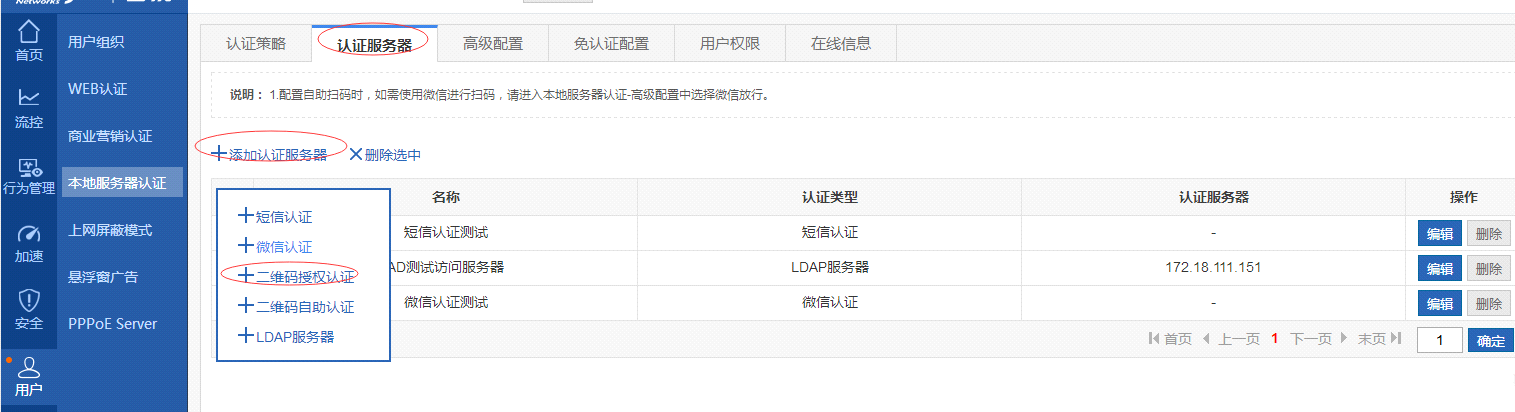账号密码认证需要先配置相应的账号,请参照“本地服务器认证”--->“本地账号密码认证”章节。这里直接从配置二维码售权认证服务器开始。