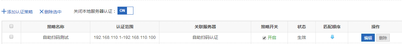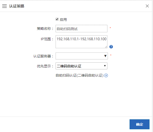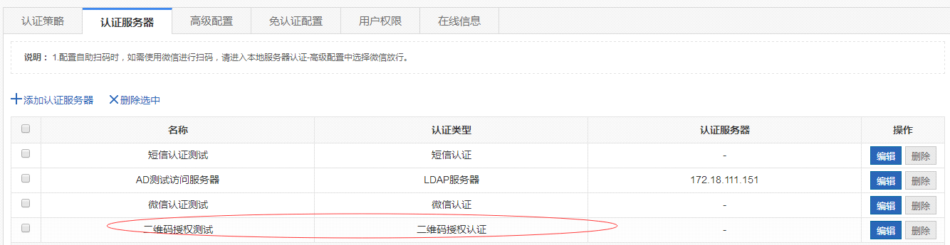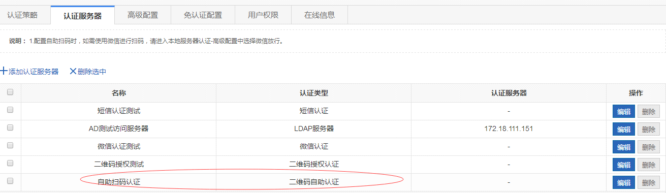 4.     认证服务器项勾选需要匹配的认证方法,本例选择“自助扫码认证”