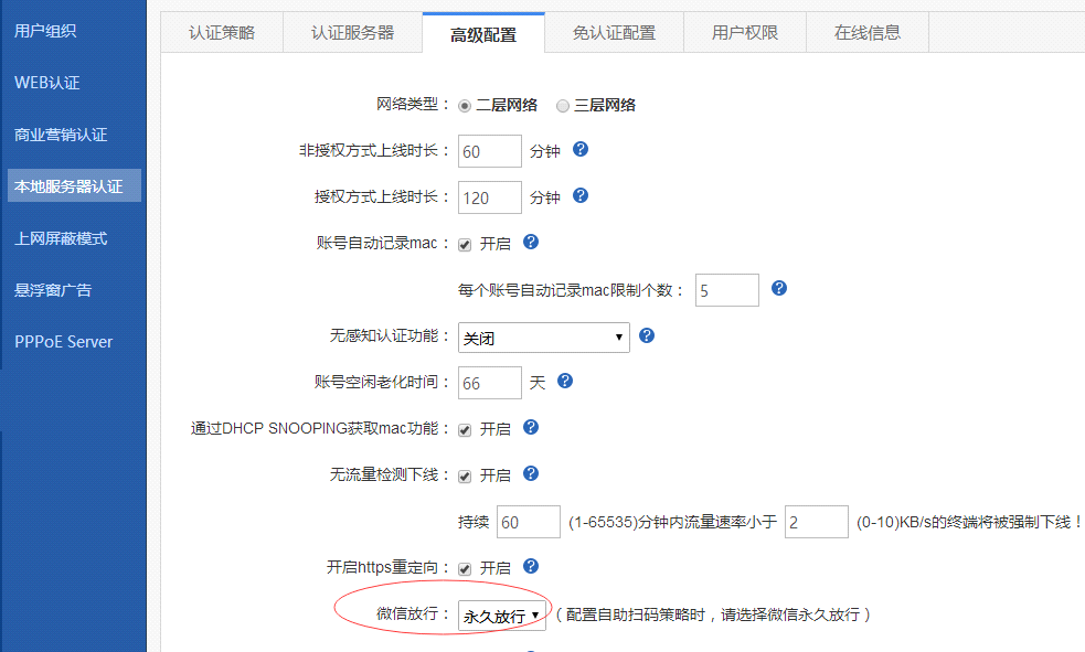 进入“本地服务器认证”--->“高级配置”中选择微信永久放行。