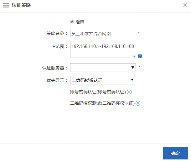 配置两个网段,其中一个网段配置成账号密码认证,另外一个网段配置成二维码授权认证。