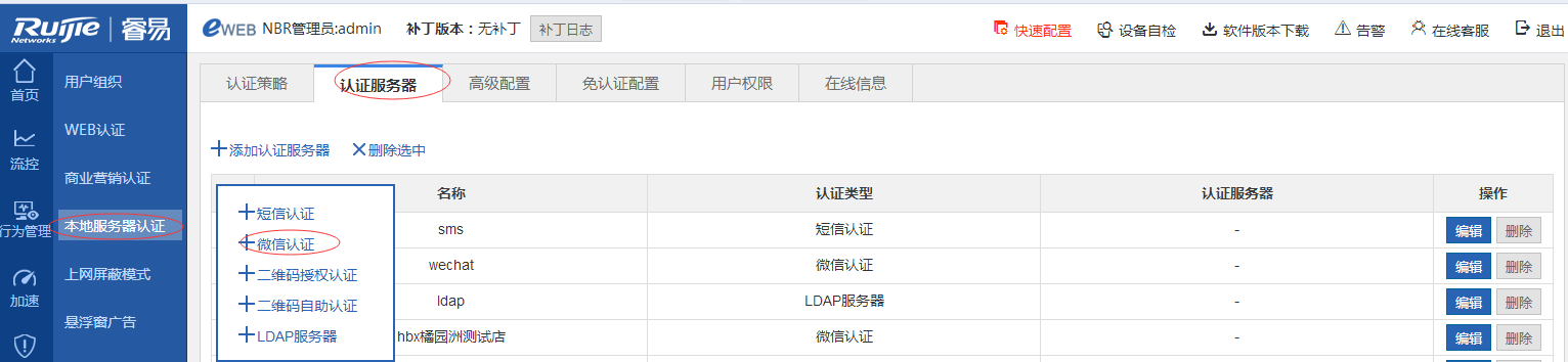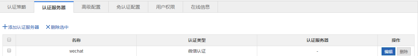 进入设备WEB页面,选择“用户”—》”本地服务器认证”, 添加微信认证服务器
