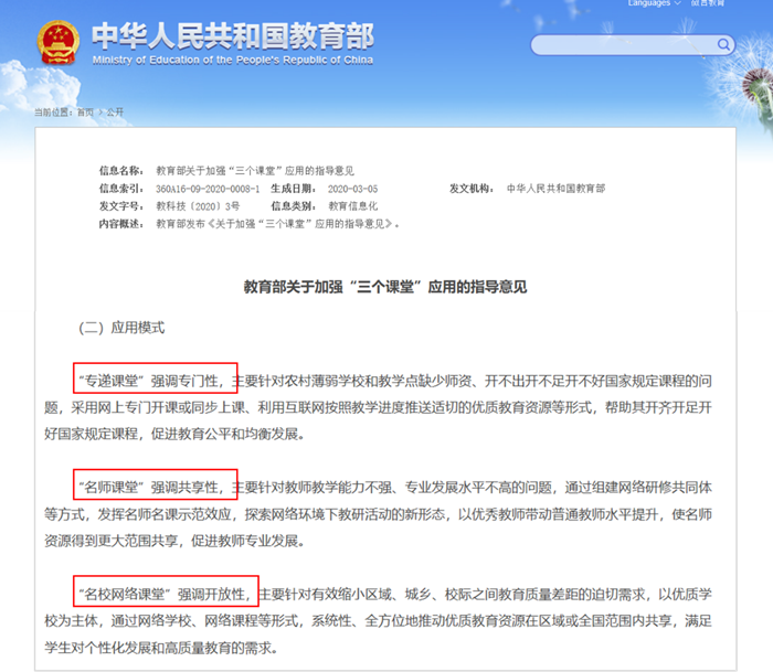 2020年3月,教育部印发《关于加强“三个课堂”应用的指导意见》,明确到2022年,全面实现“三个课堂”在广大中小学校的常态化按需应用,教育均衡问题落实到政策层面。