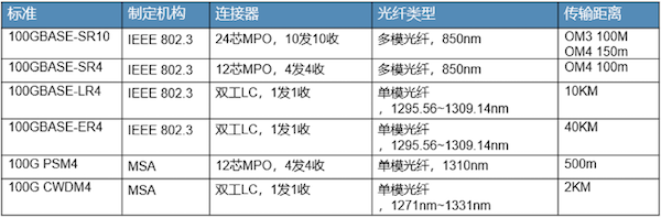 100G短距光模块标准主要有100GBASE-SR10和100GBASE-SR4两种标准。当年为了满足市场上出现的100G需求, 100GBASE-SR10标准最早被提出且应用于100G的短距互联。