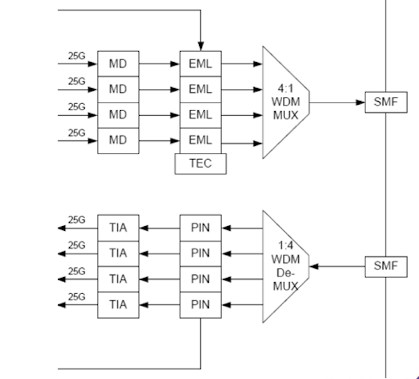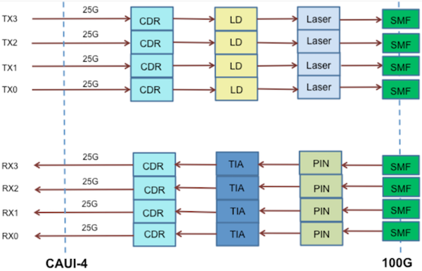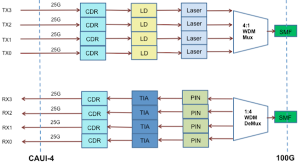 下图是100GBASE-LR4以及100G CWDM4的原理图: