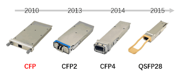 仅有光模块的光接口以及电接口规范是不够的,还需要配套的结构封装才能算是完整的光模块解决方案。100G光模块的封装格式主要有CFP、CFP2、CFP4以及QSFP28。