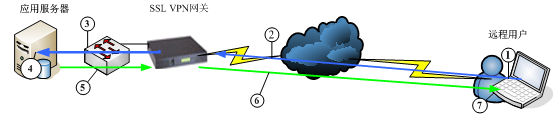 远程终端用户通过SSL VPN访问应用数据的时候,传输过程如下: