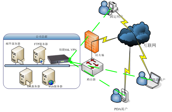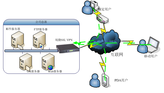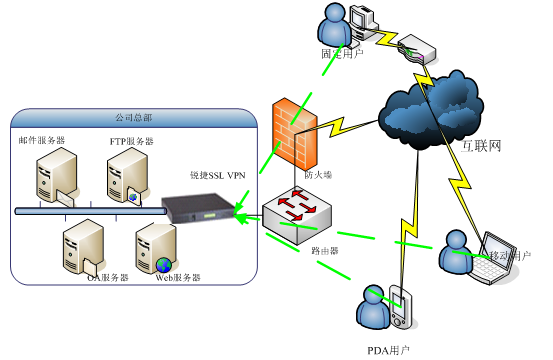 ♦ 移动用户可以任何方式接入Internet网,通过SSL VPN,移动用户可以安全访问内网的资源。