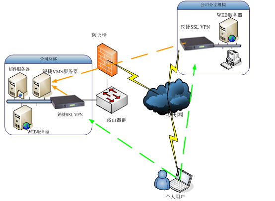 总部和分支的资源。不同地域的VPN可以通过VMS服务器集中管理,实时管理和查询登陆不同SSL VPN的用户信息。
