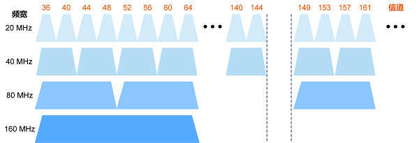 如图3-2和图3-3所示,无线局域网标准协议将2.4GHz频段划分为13个相互交叠的信道,而5GHz频段的信道则更加独立。