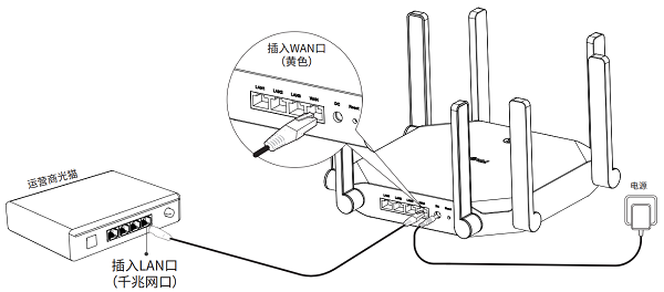家用路由器一般有一个WAN口,多个LAN口;运营商光猫一般有一个千兆口和2-3个百兆口。使用网线连接家用路由器与光猫时,要注意:网线一端最好连接至运营商光猫的千兆网口,网线另一端必须连接至家用路由器的WAN口。如下图: