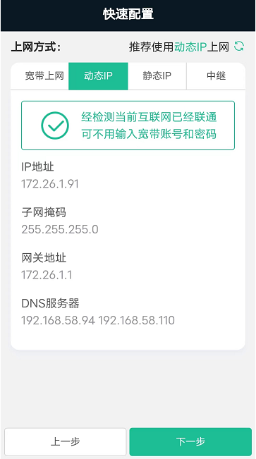 ●若上网方式检测为动态IP上网,则无需更改上网方式,直接点击<下一步>。如下图: