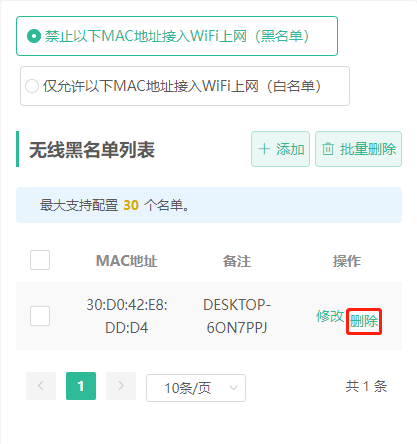 点击<删除>,该终端设备从黑名单中删除,可重新连接Wi-Fi。
