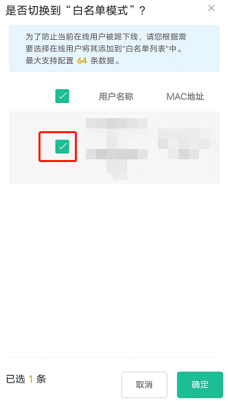 选择<仅允许以下MAC地址接入Wi-Fi上网>,仅支持已连接Wi-Fi的设备添加进白名单。勾选要加入白名单的设备,点击<确定>。