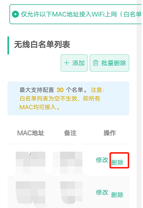 点击<删除>,该终端设备从白名单中删除,删除后该终端设备不可连接Wi-Fi。