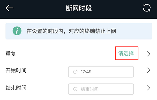(2)    点击<请选择>可设置禁止终端设备上网的日期,可选择工作日、周末或自定义日期。开始时间和结束时间是设置每个禁止日期具体的禁用网络的时间。