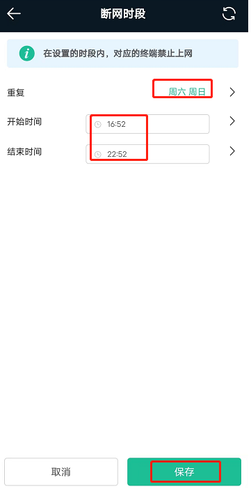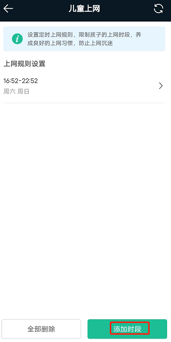(3)    点击<保存>,即可生效儿童上网功能。点击<添加时段>,可多个禁用时段。